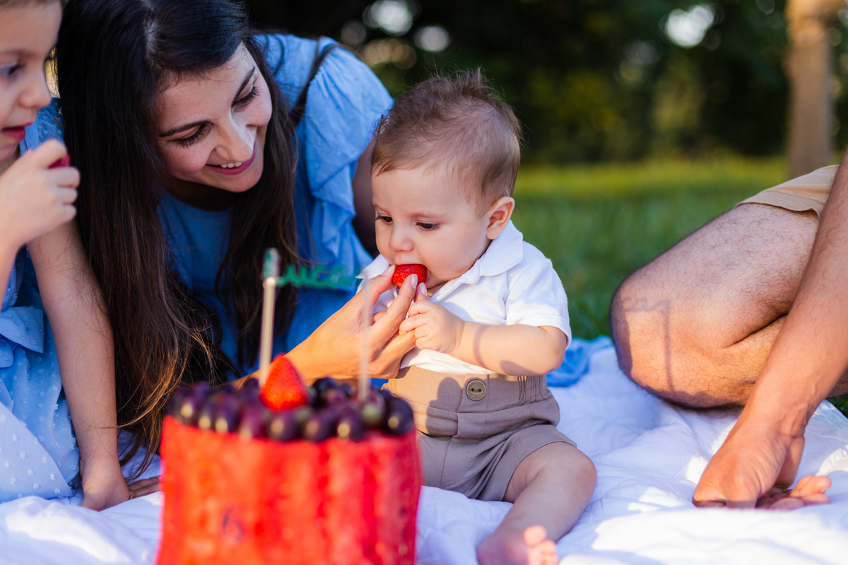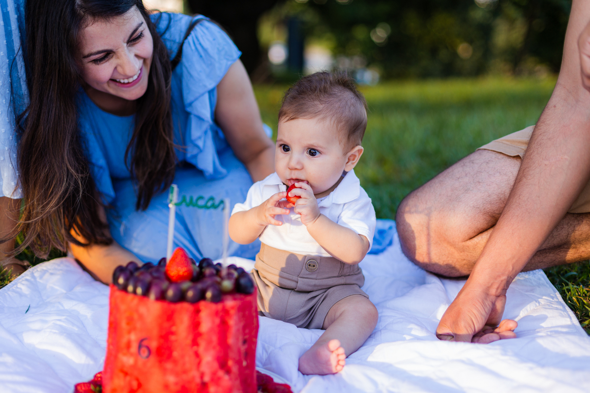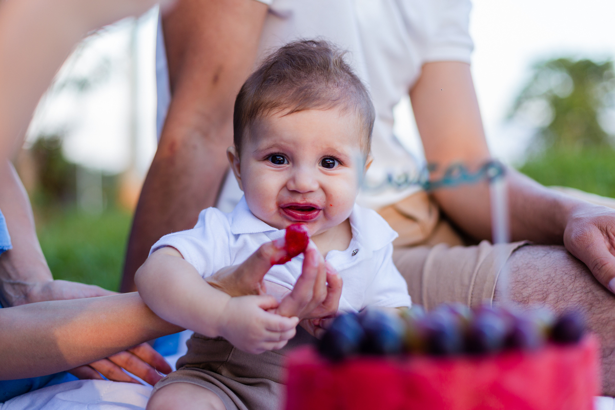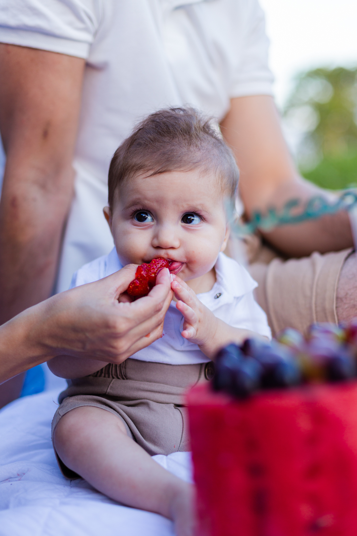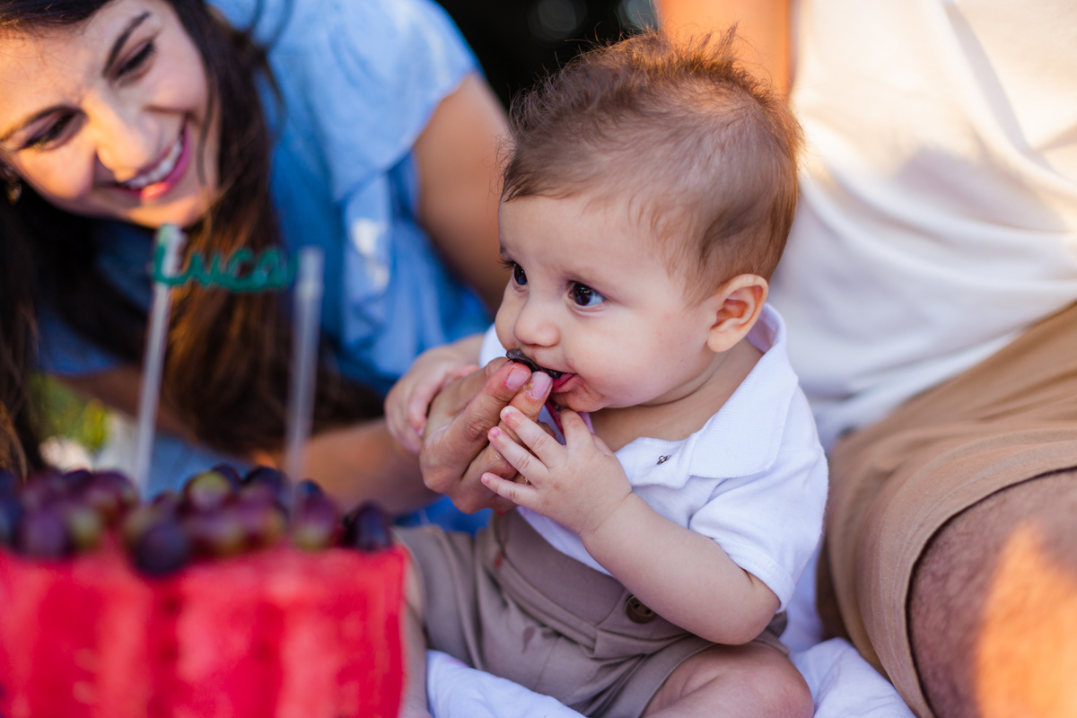 E geralmente fazemos o ensaio com a introdução alimentar. O Lucas comeu morango, uva e melância pela primeira vez!